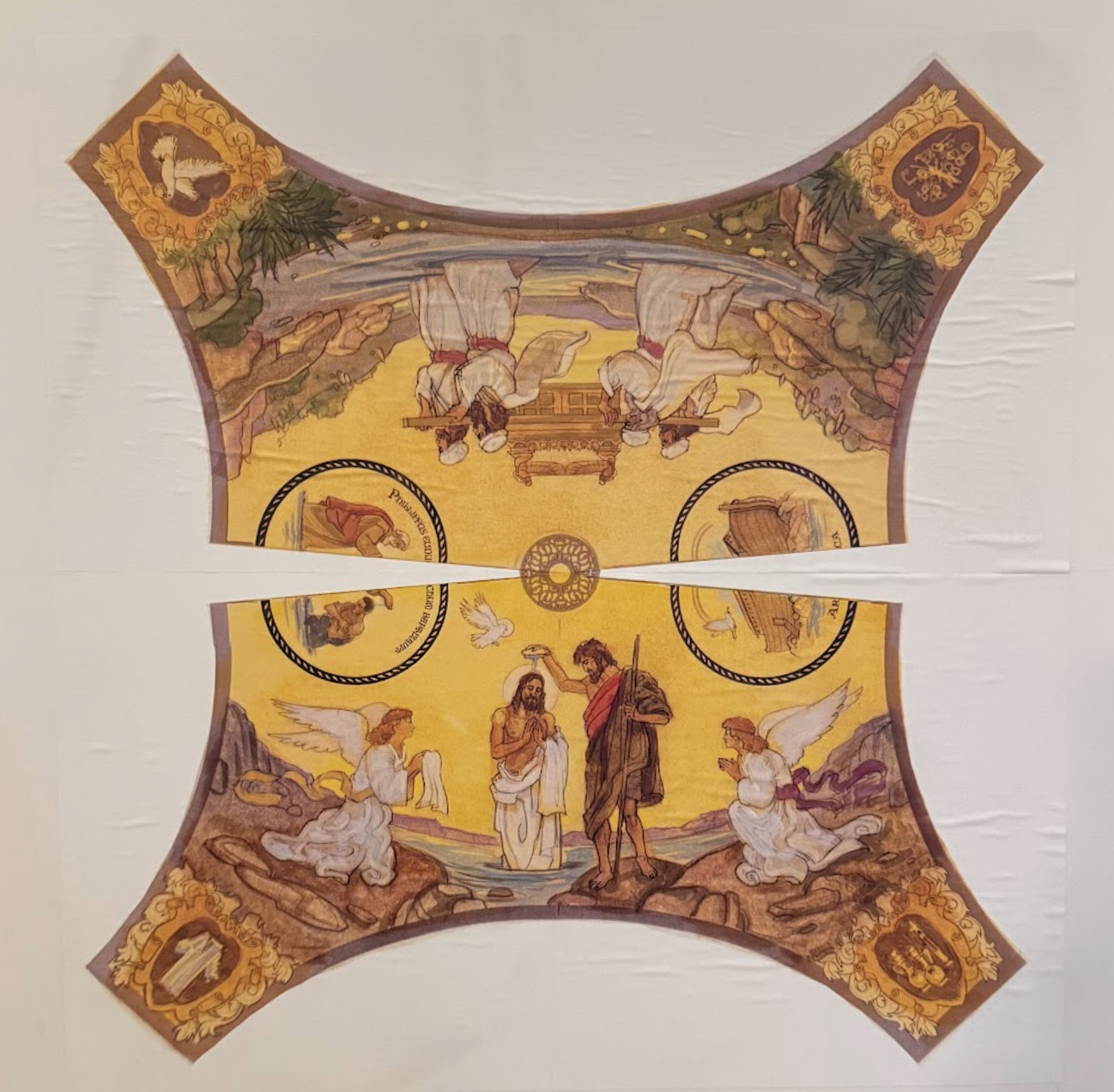 Many of you will wonder what artistic form or style the new Luminous Mysteries will take. Every effort from the beginning has been made to envision and ensure that the depiction of the five new mysteries will follow upon and be seen as complementary to the elements and classic style of Jan Henryk de Rosen, the original artist who depicted the 15 mysteries of the Rosary in time for the dedication of the Cathedral in 1940. Thus the images of the Luminous Mysteries will present the New Testament scene of each mystery with its corresponding Old Testament prefigurement, there will be roundels or tondi which harken to related scriptural scenes, and escutcheons which bear imagery or iconography which elucidate the mystery. Just as in the great medieval Cathedrals the art was to serve a catechetical purpose, so too our new Luminous Mysteries will, we trust, appear seamlessly harmonious with the other mysteries of the rosary depicted in the vaults of the side aisles. This project will hopefully be completed within six to eight months.