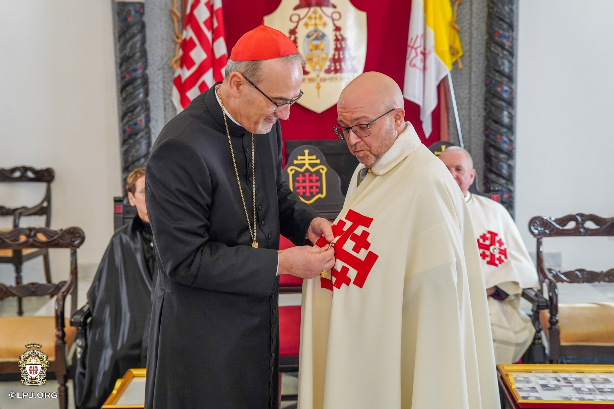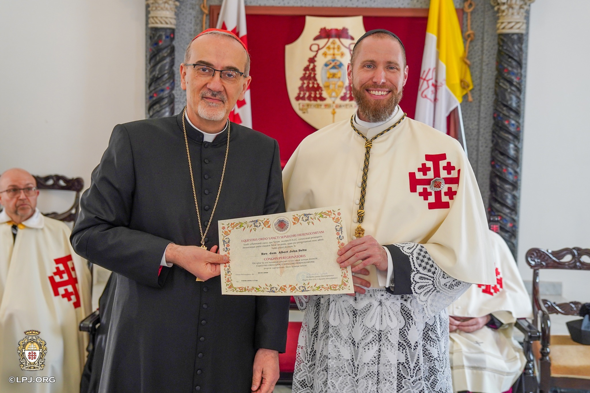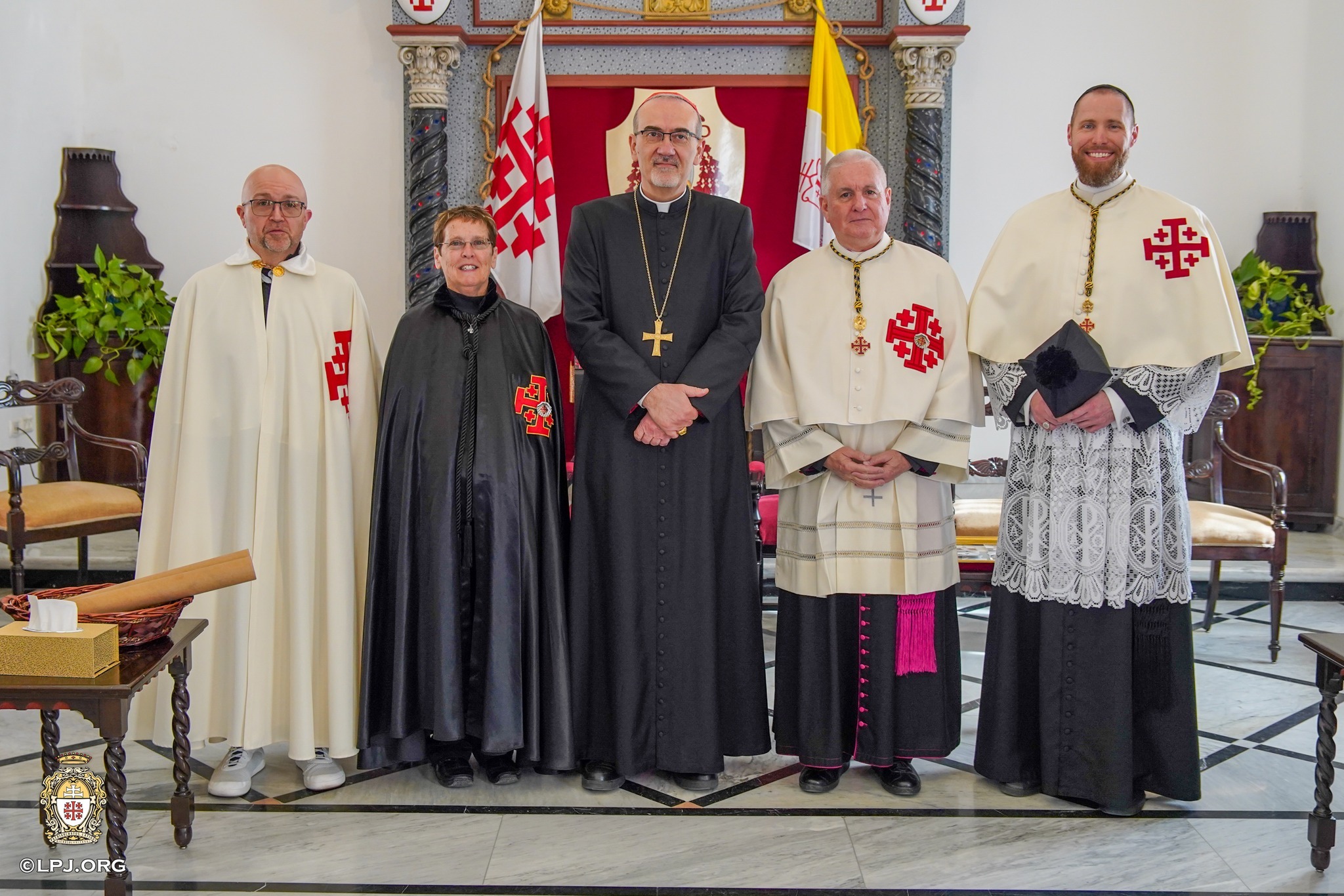 On Thursday, January 20, 2026, Cardinal Pierbattista Pizzaballa, Latin Patriarch of Jerusalem, welcomed a delegation of Knights and Dames of the Equestrian Order of the Holy Sepulchre of Jerusalem, led by Msgr. William Kubacki, KCHS. Among the group were pilgrims from the Diocese of Toledo, including two visitors who received the Pilgrim Shell during their journey: Fr. Albert Beltz, KHS and Deacon Brian Whitta, KCHS.