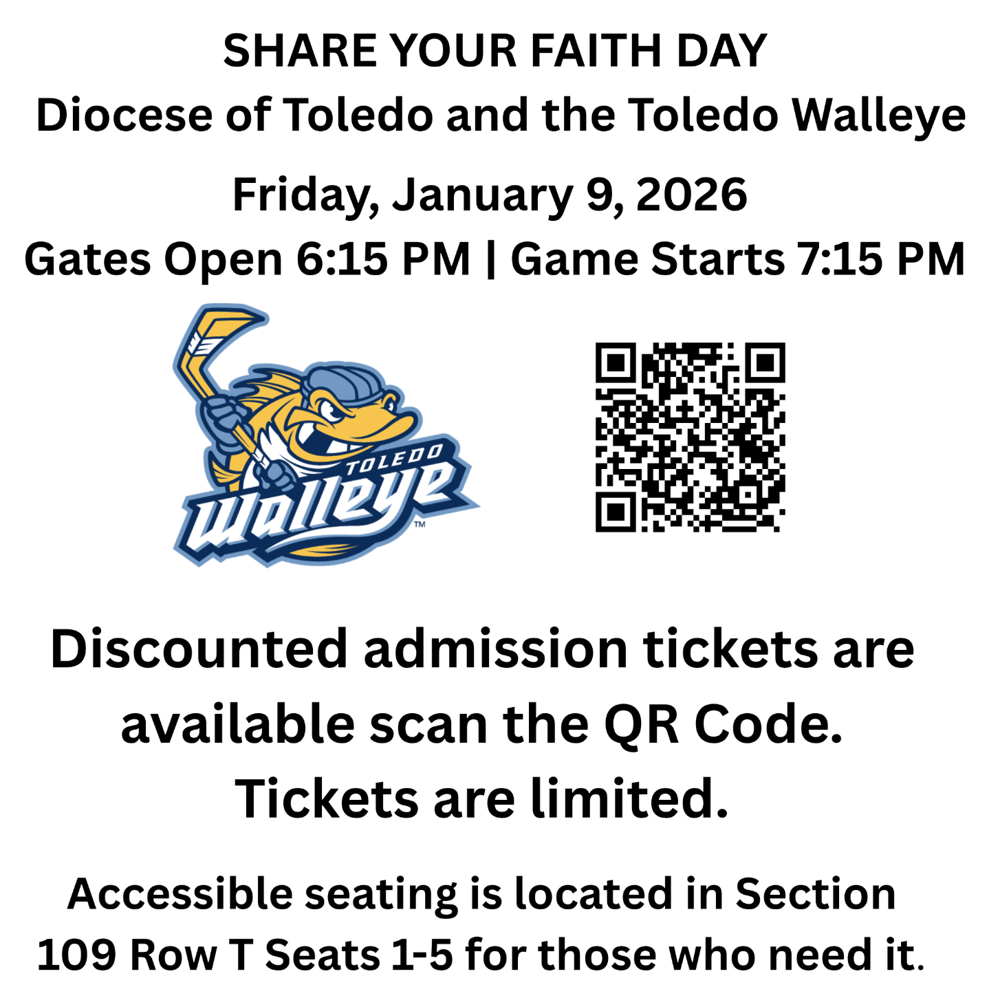 Bulletin Inline: Experience an exhilarating evening of hockey as The Catholic Diocese of Toledo invites you to cheer on the Toledo Walleye in their thrilling game against the Iowa Heartlanders on January 9th at 7:15 pm. Don't miss out on the excitement at the Huntington Center - a perfect outing for families and sports enthusiasts alike. Get your tickets before Dec. 26 and be part of the action:https://www.gofevo.com/event/Catholicdiocese21