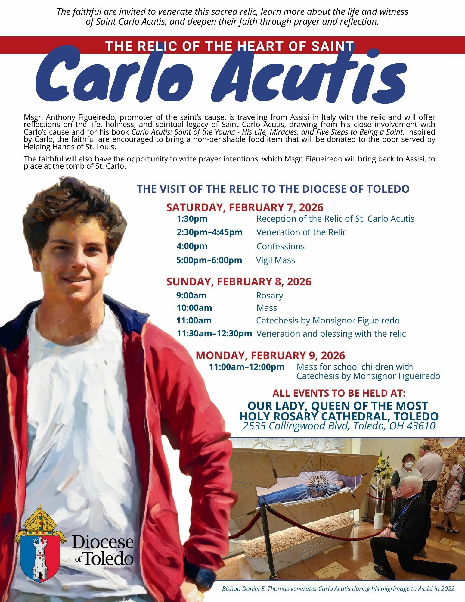 The Diocese of Toledo is honored to welcome Msgr. Anthony Figueiredo from Assisi, Italy, with the Relic of the Heart of Saint Carlo Acutis. This is a special opportunity to venerate the relic, learn about the life and witness of Saint Carlo, and grow in faith through prayer and reflection.