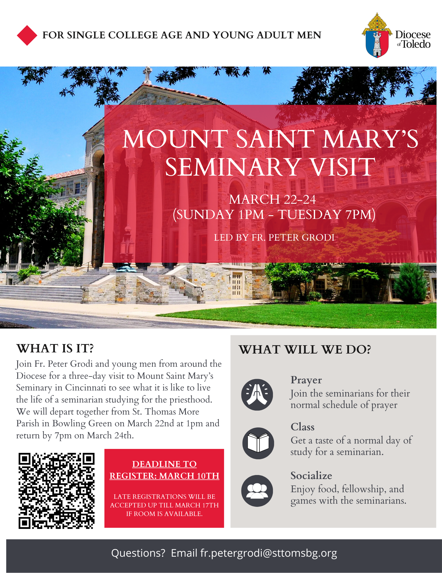 Participants will experience seminary life firsthand through prayer with the seminarians, attending classes, and enjoying fellowship, meals, and games. The group will depart together from St. Thomas More Parish, Bowling Green, on Sunday, March 22 at 1:00 p.m. and return by Tuesday, March 24 at 7:00 p.m.