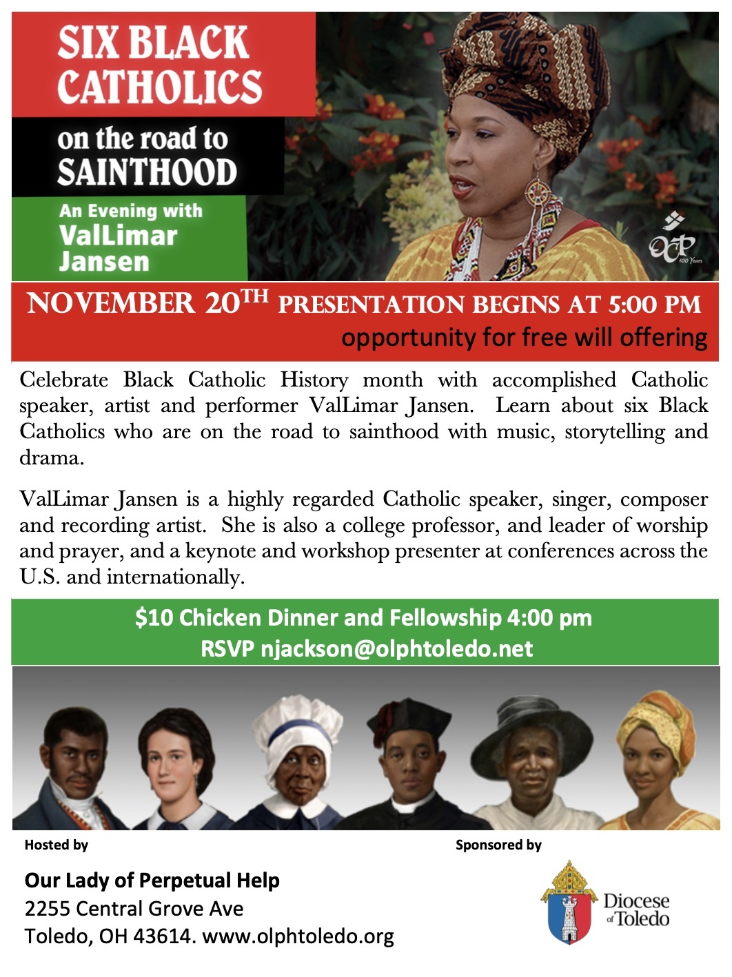 Celebrate Black Catholic History month with accomplished Catholic speaker, artist and performer ValLimar Jansen. Learn about six Black Catholics who are on the road to sainthood with music, storytelling and drama.