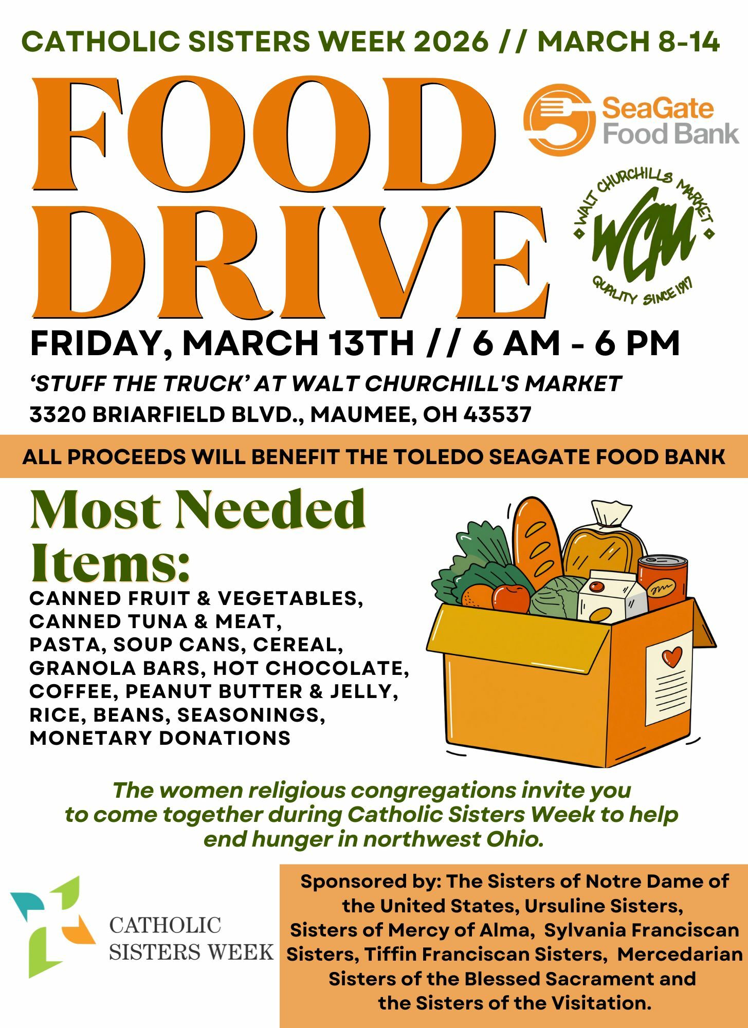In celebration of Catholic Sisters Week (March 8–14), women religious congregations across northwest Ohio are hosting a “Stuff the Truck” food drive benefiting the Toledo SeaGate Food Bank. Donations of shelf-stable food items and monetary contributions are welcome.