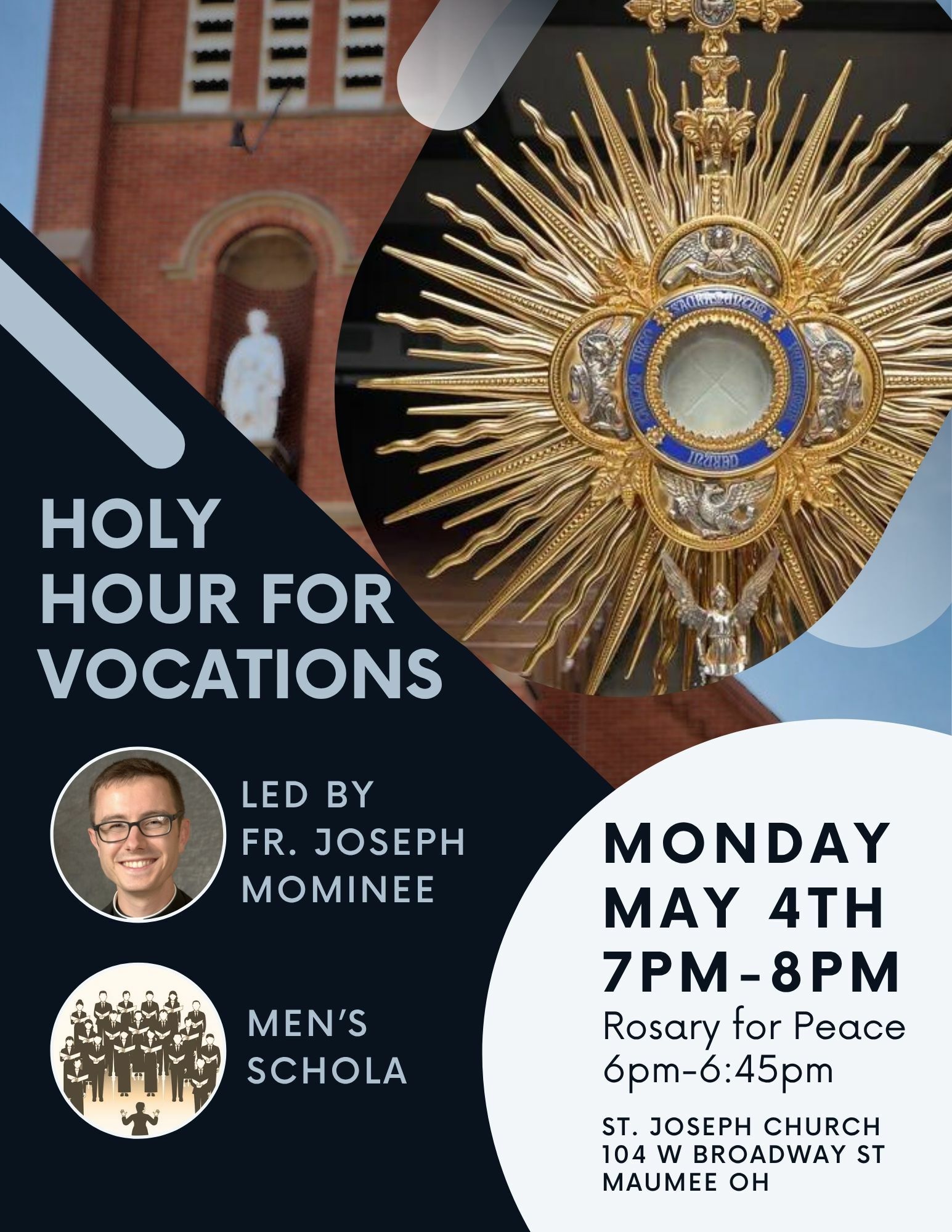 You are invited to join us on Monday, May 4th, at 7:00 PM at St. Joseph Catholic Church, located at 104 W. Broadway Street, Maumee, Ohio. This special Holy Hour is dedicated to praying for vocations and is an opportunity for our community to come together in faith and unity.