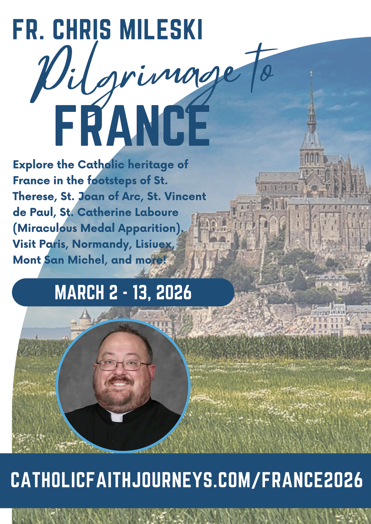 Join Fr. Chris Mileski of Most Pure Heart of Mary (Shelby, OH) & St. Joseph (Plymouth, OH) on a pilgrimage to France! Explore the Catholic heritage of France in the footsteps of St. Therese, St. Joan of Arc, St. Vincent de Paul, St. Catherine Laboure (Miraculous Medal Apparition). Stroll the streets of Paris, visit the UNESCO World Heritage site of Mont San Michel, walk the beaches and cemetery of Normandy, and stand at the place where St. Joan of Arc was martyred. Admire the stunning architecture of the Gothic and Romanesque cathedrals of France. Fr. Mileski will offer the Holy Sacrifice of the Mass daily at many of these breathtaking sites.